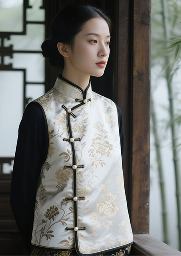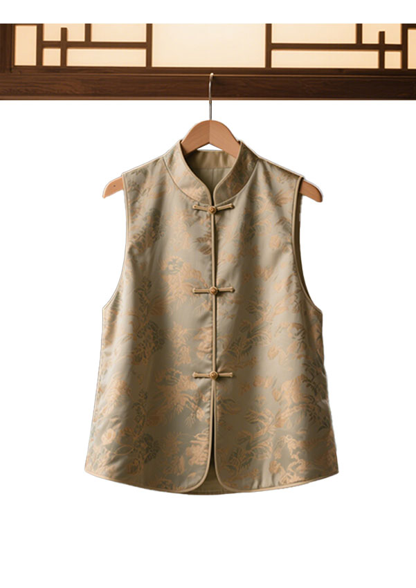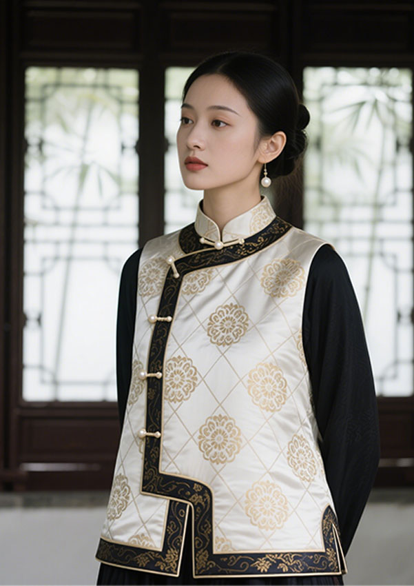 无论是茶席雅集、职场通勤,抑或婚礼庆典,皆能适配多元场景,于举手投足间展露“谦谦君子,温润如玉”的东方气韵。 新中式马甲不止于衣,更是一场古今对话——它用当代设计语言解构传统,让文化自信化作可穿戴的艺术,让每个穿着者成为东方美学的传承者与革新者。