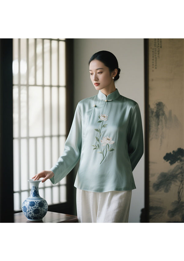 摒弃繁复,重塑经典.衬衫领口融入中式立领改良设计,搭配手工玉石盘扣或暗纹刺绣,既保留“含蓄内敛”的东方韵味,又赋予脖颈线条利落之美.衣身采用不对称剪裁或侧开衩设计,线条流畅如墨,行走间衣袂轻扬,自带新中式独有的松弛感.面料选用桑蚕丝,提花绸缎或哑光醋酸,肌理间暗藏水墨竹影,缠枝莲纹等传统元素,以暗纹提花工艺低调呈现,光影流转间尽显雅致 .